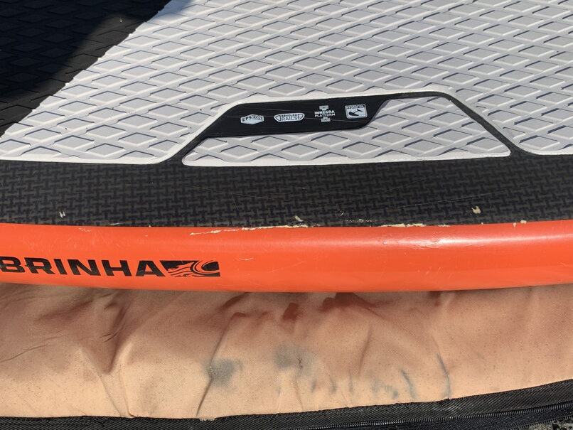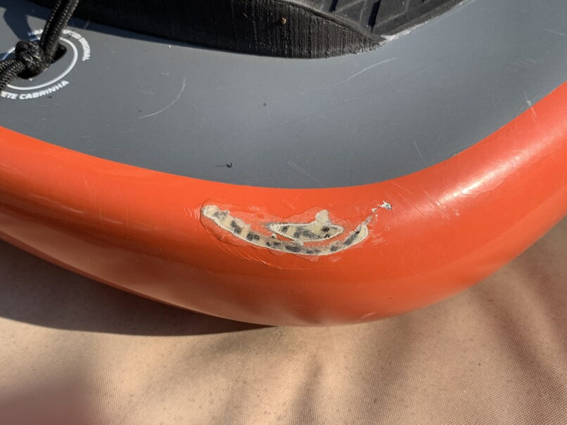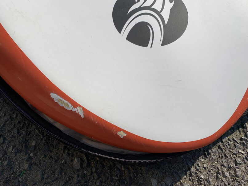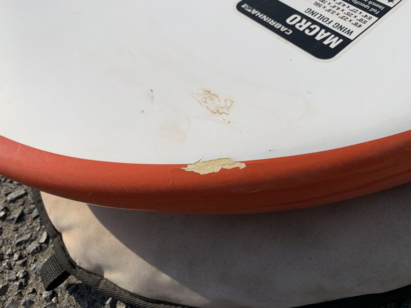 コンデションは、ノーズデッキ側レイル5㎝弱ヒビ、右側レイルデッキ側ヒビ15㎝ぐらい、右側レイル、テール、ソーラーレジンで修理歴有、左側レイル、デッキ側5-6㎝ヒビ有り、ボトムレイル右側ノーズ寄り塗装削れ、ボトムヘコミ少、BLOW UPのストラップとボードケース付き。 クラッグはテープ修理かソーラーレジンで修理してお出しします。