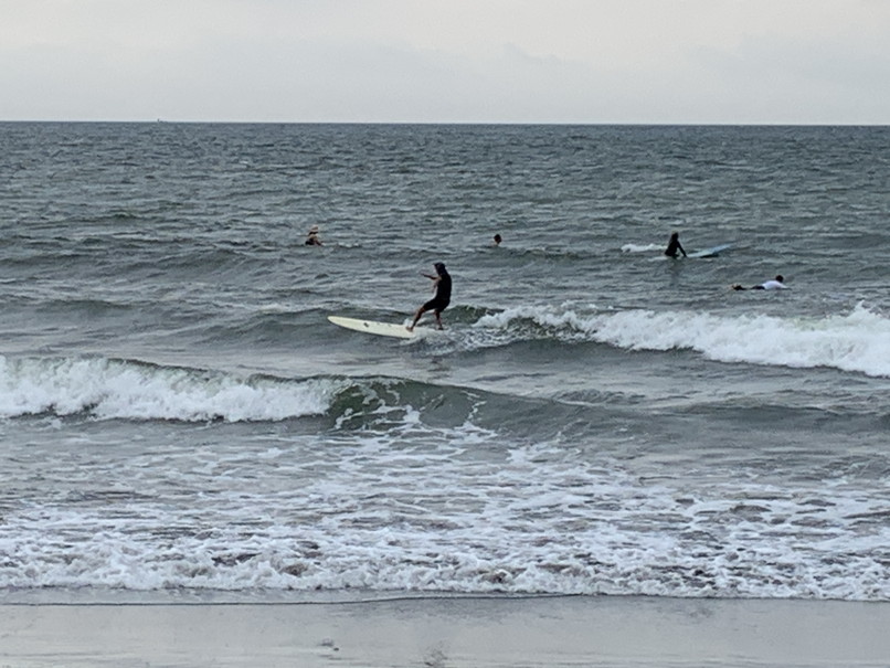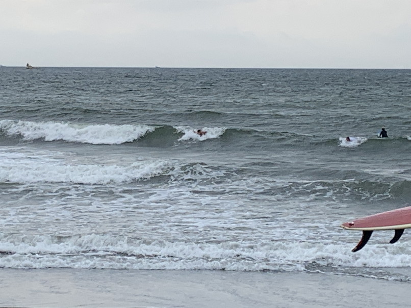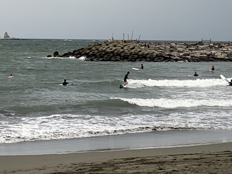 波はモモ前後、オンショアの影響で厚めやダラダラなブレイク、選んでちょっと滑れる。