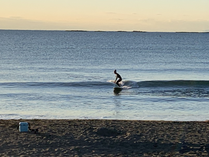 波はたまにヒザ近いウネリは入るが割れずショアブレイクになるのみ、ウネリからいけるロングで何とか立てる程度。
