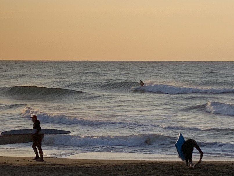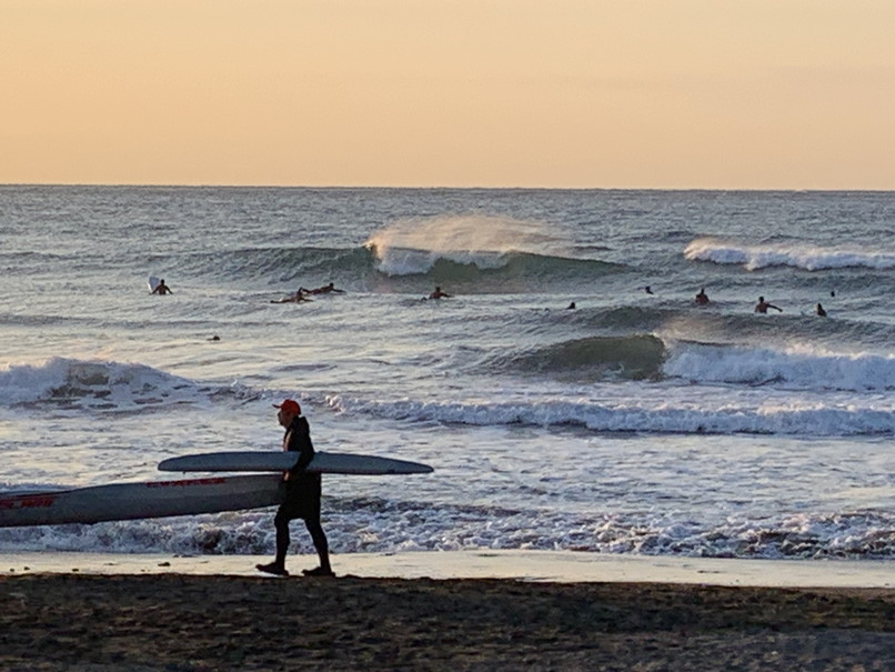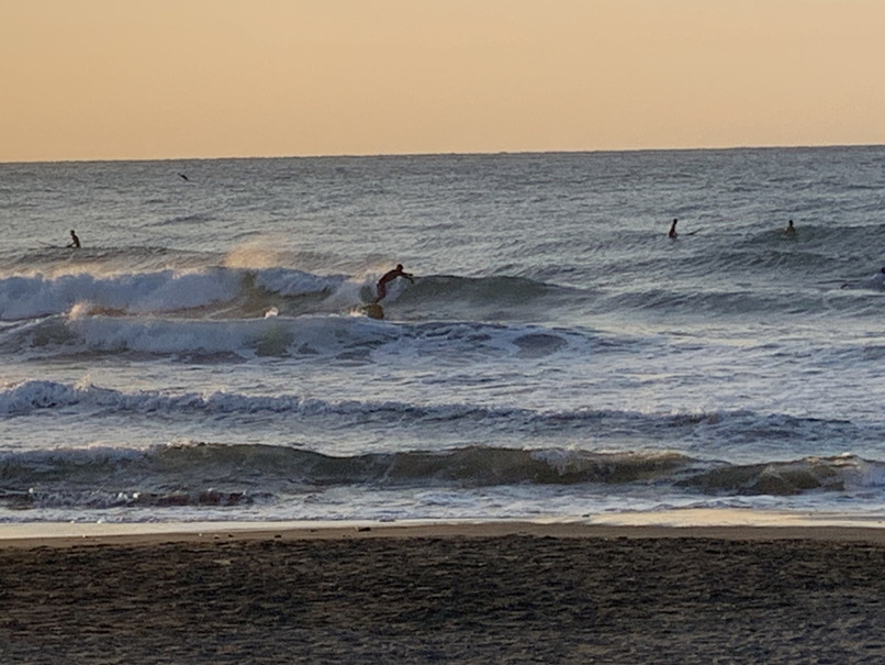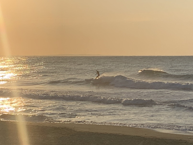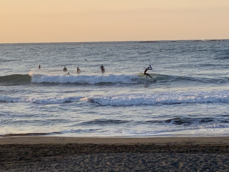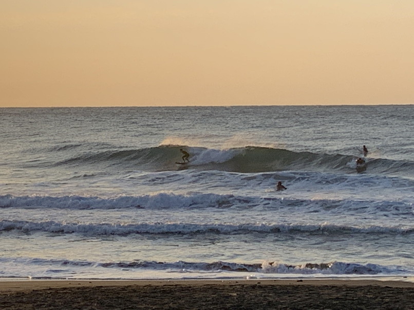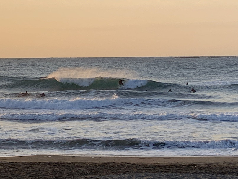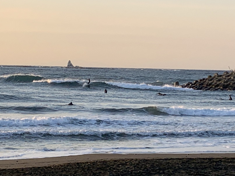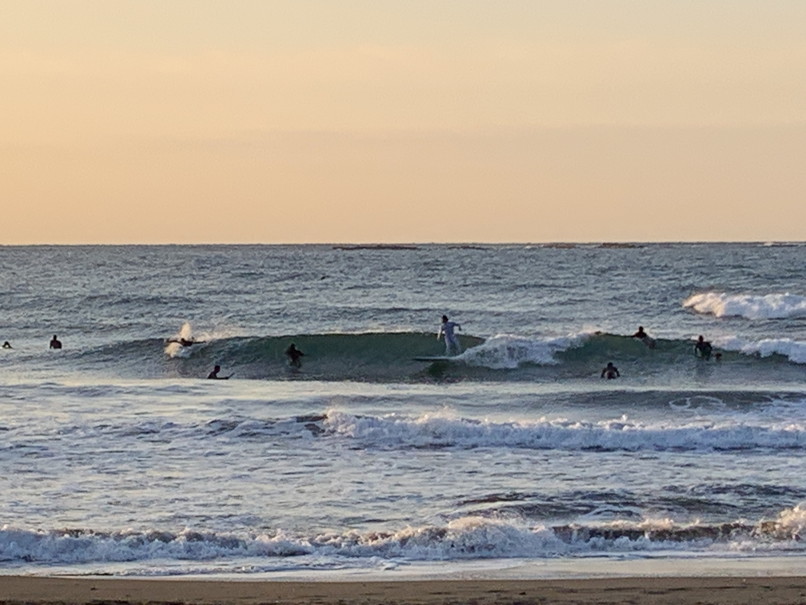 波はコシハラたまにムネぐらい、ややバラけた厚速めなブレイクながら形の良いのも有り走れる。風が入る前早めに。