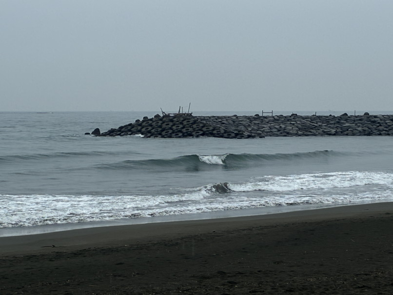 波はたまにヒザ、ややバラけた岸近くのほぼショアブレイク、ロングでなんとかって感じ。